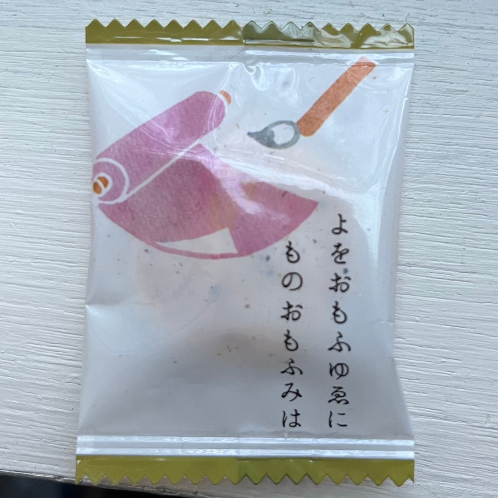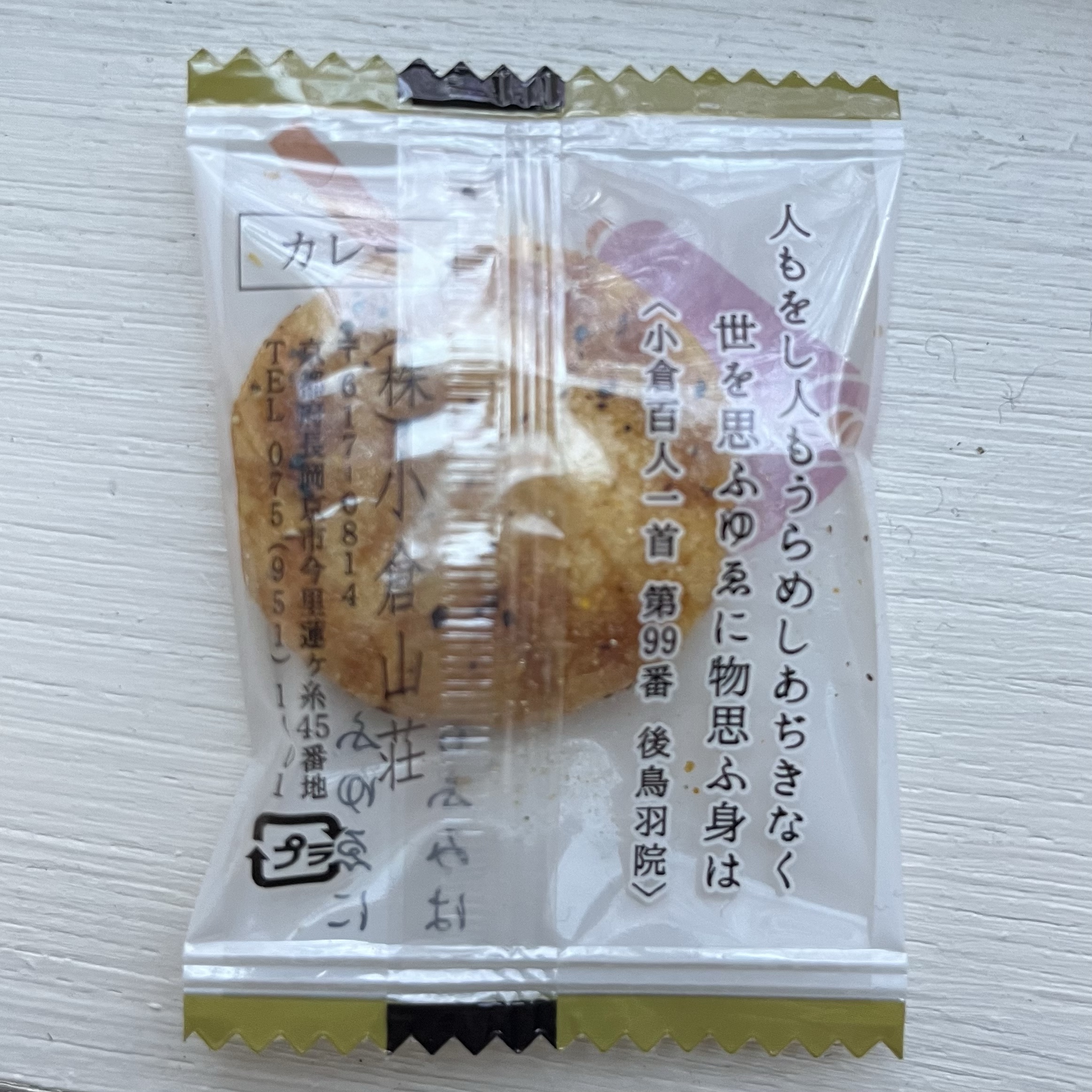 In Japan, gift-giving (omiyagé お土産) among friends and relatives is a common tradition, and recently a friend returned from Japan and gave us some special crackers (senbei) featuring poems from the Hyakunin Isshu. The crackers come in different flavors, and the wrapper each has a random poem.