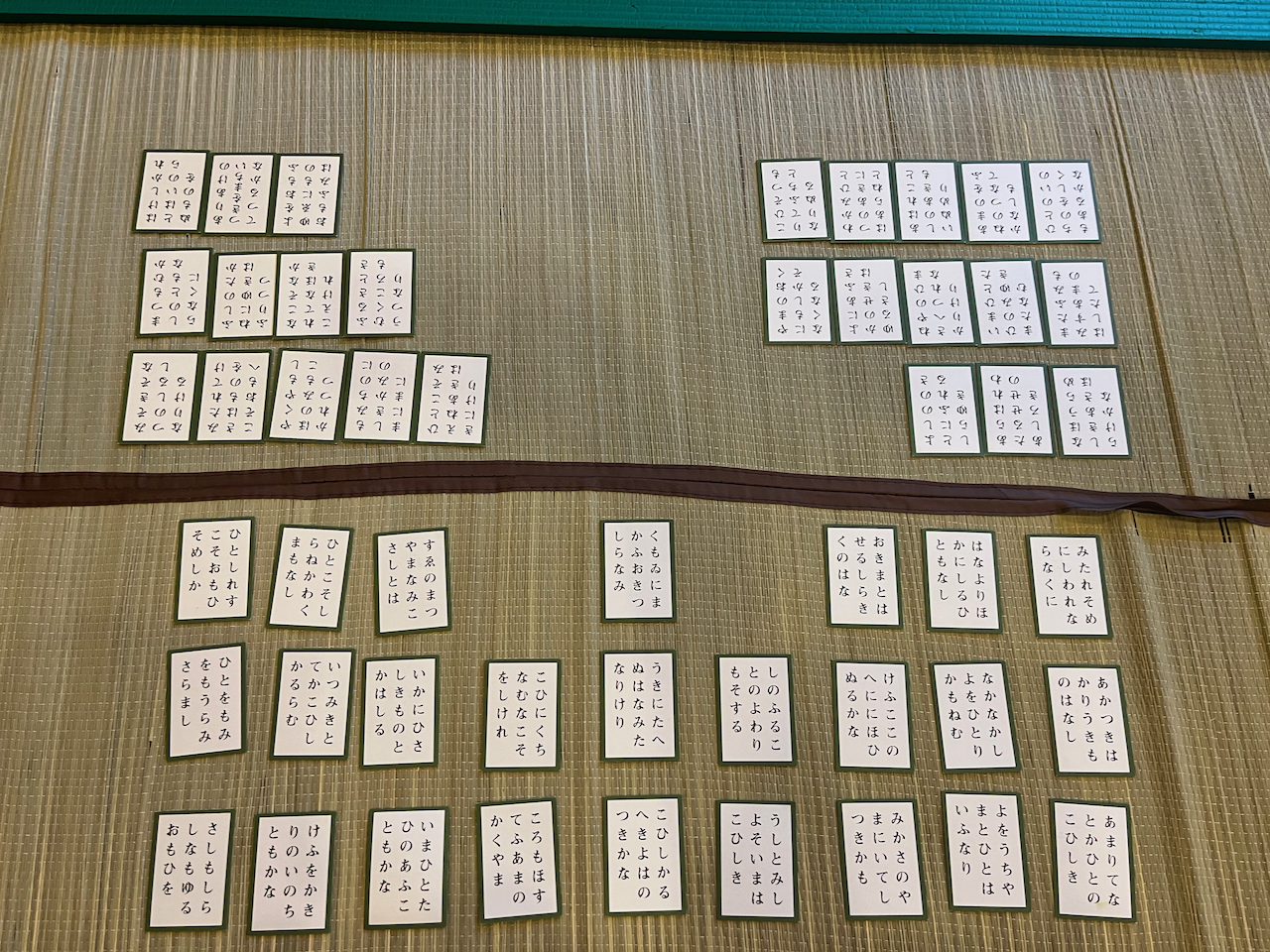 One of the things that immediately struck me was that the torifuda (取り札), that is the cards you take, have no marks to distinguish hiragana て versus で, or ち versus ぢ, etc. I presume this is by design, and yet after all this time I had simply never noticed before. 😅 In any case, my brain struggled to make sense of my board for the first few minutes until I started to pick out verses I knew. But it was too little, too late.