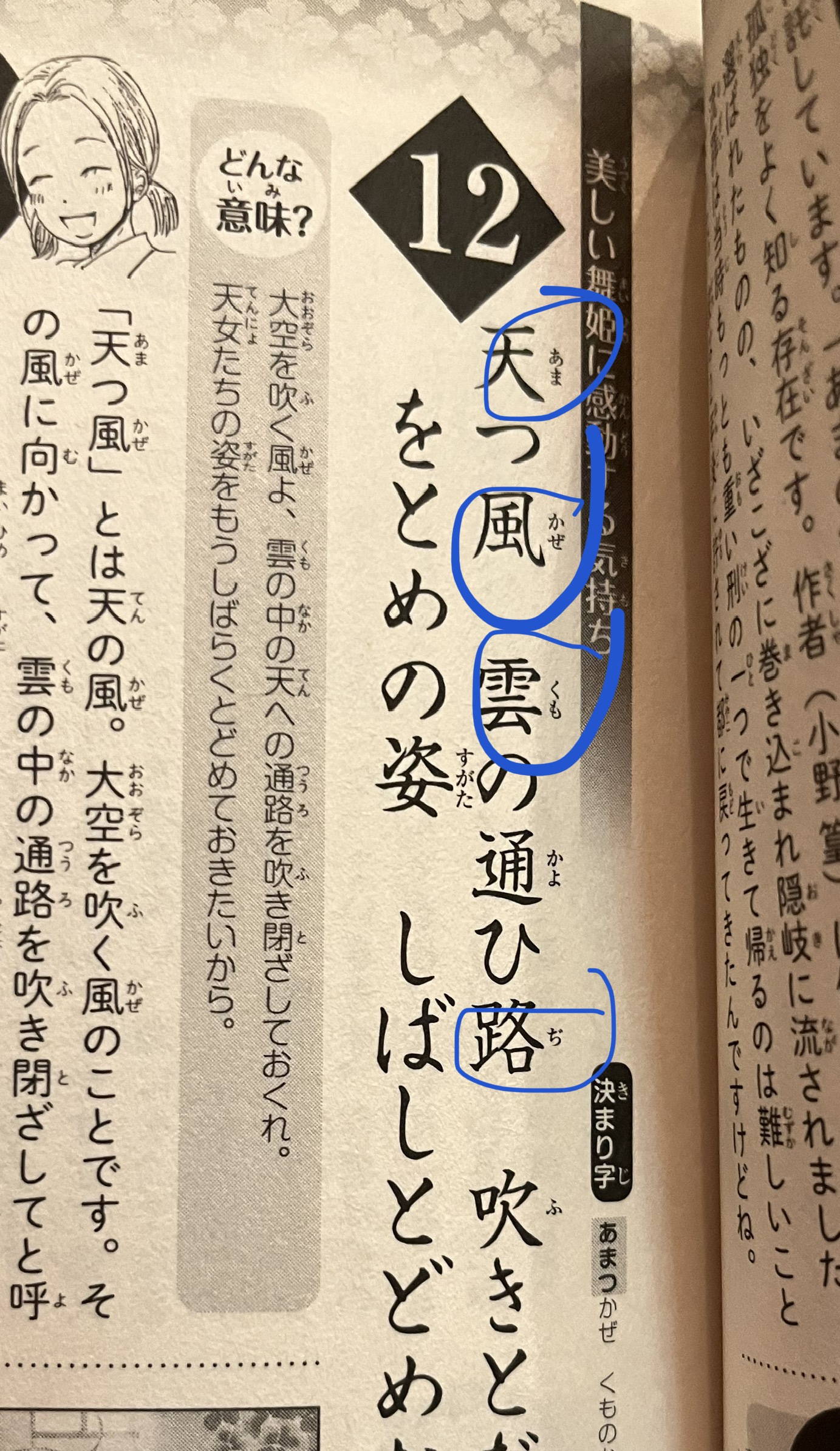 For this reason, Japanese students of the Hyakunin Isshu often rely on furigana pronunciation guides when reading about the Hyakunin Isshu. For example, this excerpt from a Chihayafuru manga my daughter has shows examples of furigana usage:
