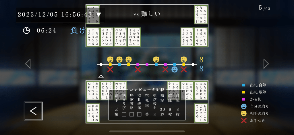 If you play solo mode on the online karuta app, you are not pressed for time. You can slow down, pay attention to the reader, and then take the card when you recognize it. It is also a good way to catch your bad habits, test your different card arrangements, etc. It’s a surprisingly handy tool for improving your game.