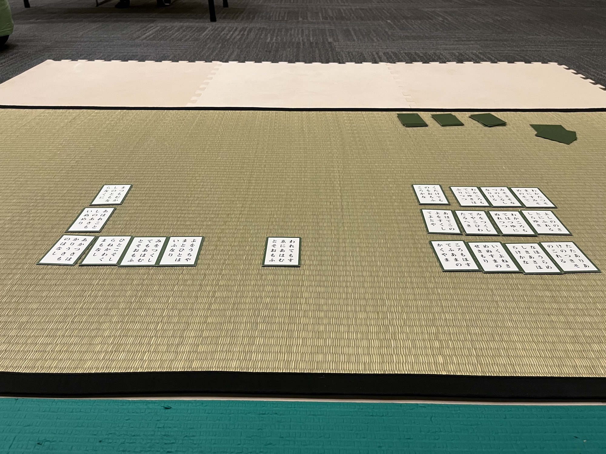 One of the first challenges when you start a game of karuta is to figure out where to put your cards. You’ve been dealt 25 torifuda cards out of 100 total (or 8 if you’re playing online) and they need to be arranged somehow in 3 rows (2 online) such that you can remember where they are, and hopefully make it harder for your opponent to take your cards.
