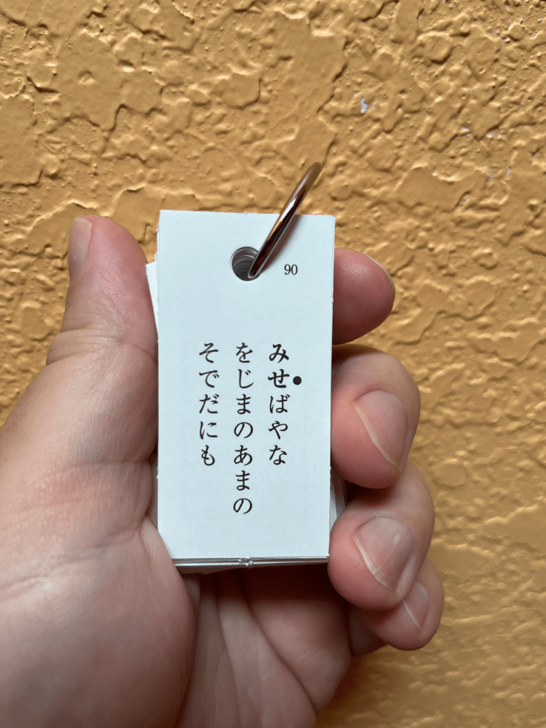In 2023, during a visit to Kyoto, I picked up some flashcards for memorizing the kimari-ji syllables of the Hyakunin Isshu poems (product link here). These flashcards were really helpful in those first few months of learning to play karuta, and although I don’t really use them anymore, I kept them around for nostalgia…